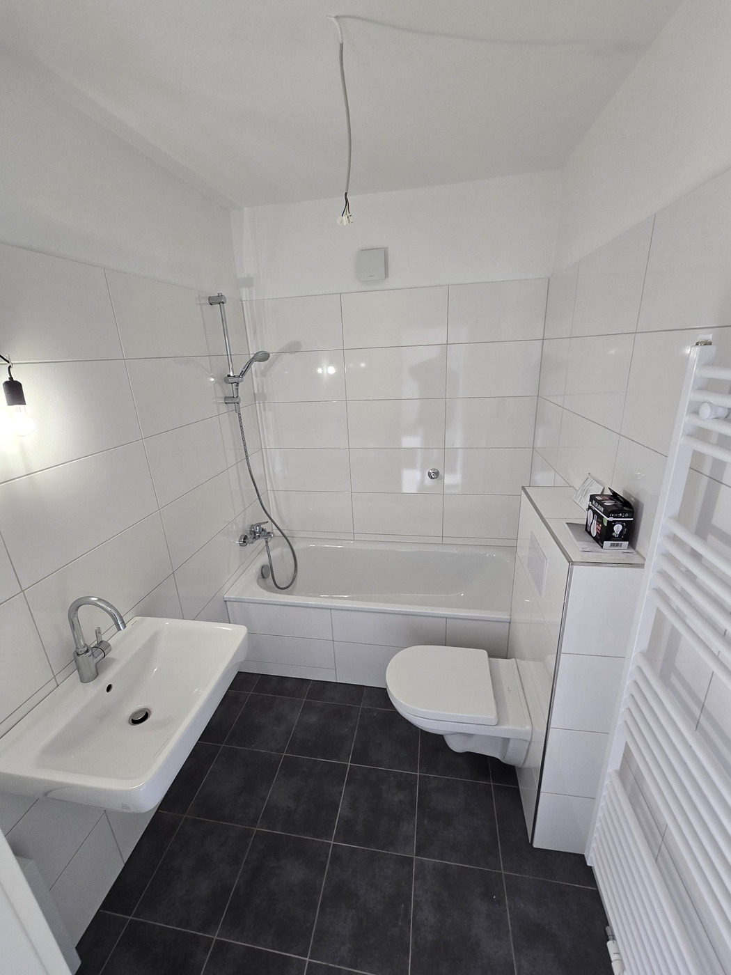 – Frisch saniertes Bad mit Wanne, Hänge-WC, Waschtisch, Heizung als Handtuchtrockner, großflächige Fliesen in anthrazit (Boden) und weiß (Wände)