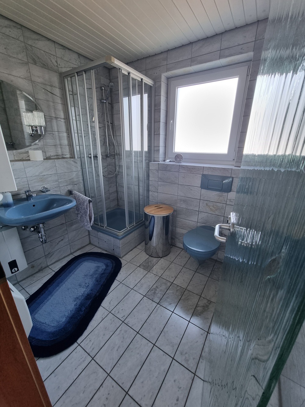 – Bad mit weiß-grau marmorierten Wand- und Bodenfliesen sowie blauen Sanitärobjekten