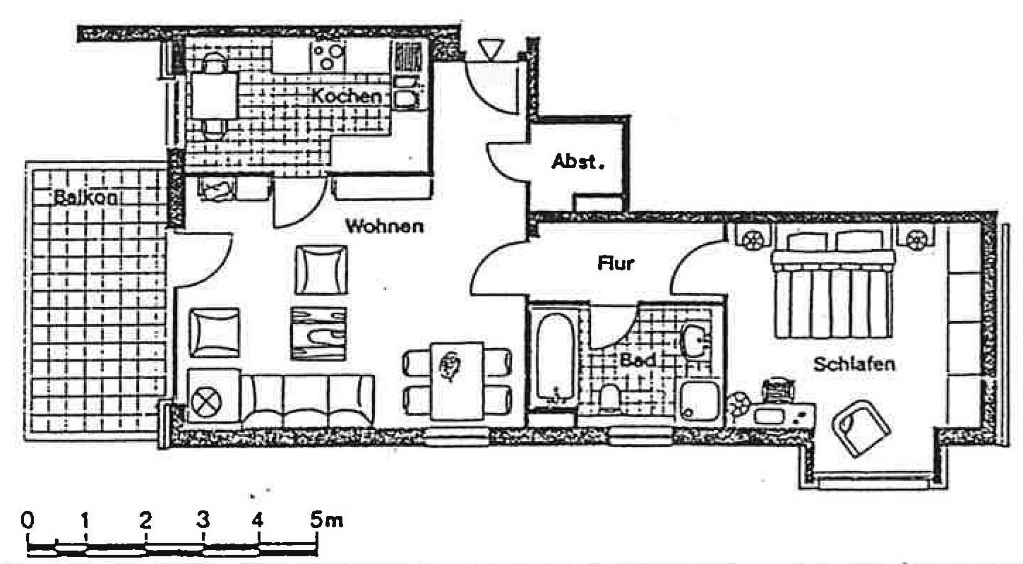 Eingangsflur, Abstellraum, großzügiges Wohnzimmer mit Zugang zur Küche mit Essbereich sowie Ausgang zum Balkon, Flur vor dem Schlaftrakt, Bad mit Wanne, WC, Dusche und Waschtisch, Schlafzimmer, 1 Kellerraum, gemeinschaftliche Waschküche